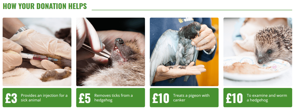 Once you click donate, there’s some really lovely donation triggers. They are both animal and treatment specific, making them great for virtual gifting, but also making personal donations really tangible.