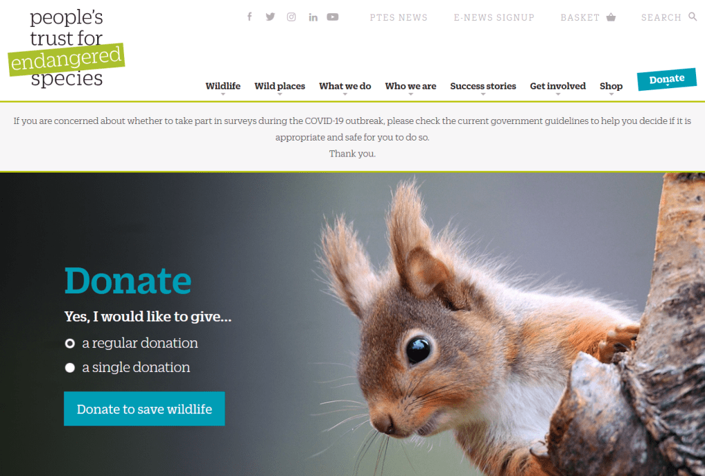 Once you hit the Donate page, it’s beautiful. The colouring of the menu button is mirrored in the hero image. The eyes of the beloved red squirrel lead you straight to the button and the call to action itself reminds you of the cause you are supporting.