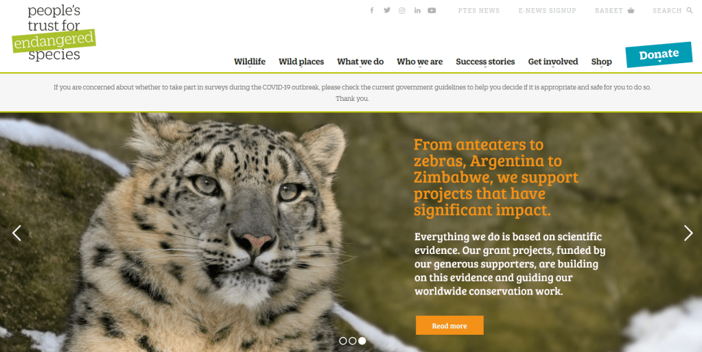 We love how the quirky angle of this button perfectly complements the brand logo for People’s Trust for Endangered Species. The donate button is easily the most impactful button on the menu, although the orange used in the hero banner does stand out a little stronger than the blue button.