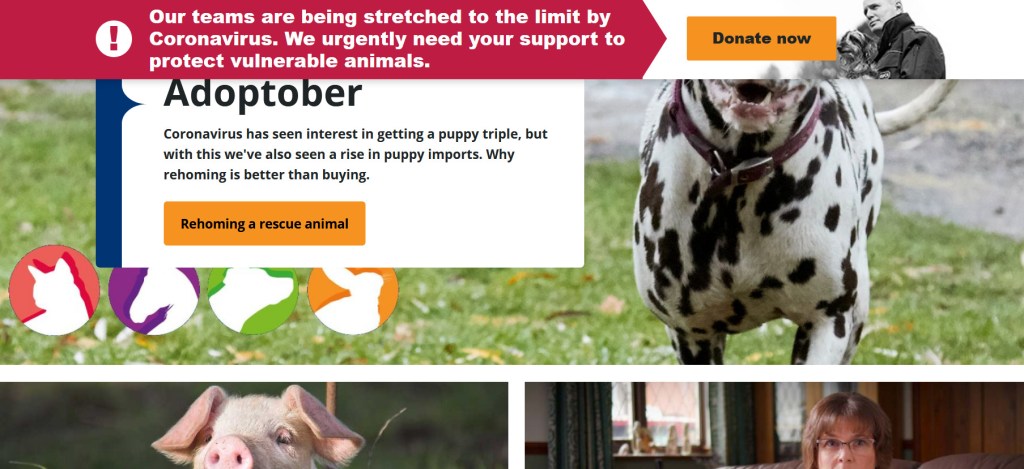 As you scroll on the RSPCA site, a COVID banner appears with an urgent message. The use of red and the exclamation mark immediately draw your attention. The chevron then guides your eye to the button. The orange button stands out against a small black and white image, which helps to convey the seriousness of the appeal.