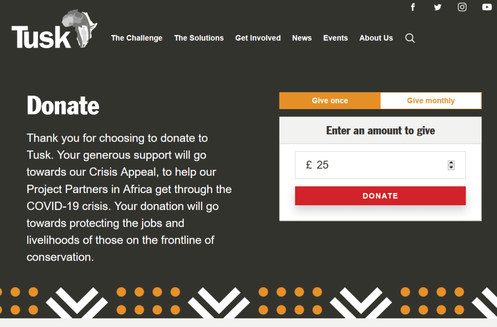 We love this bold red button from Tusk. Red is a risky choice, usually associated with warnings and danger, however, red associates well with the threat that the animals are facing. The only thing we’d change is the red Play button on “The Tusk story” as it detracts from how well the Donate button stands out.
